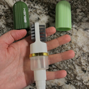I stumbled upon this shoe cleaner and realized it's a brilliant travel companion. With constant shoe scuffing from boarding planes and navigating crowded airports, this tool is a lifesaver. Despite being slightly larger than expected, it's perfect for my big hands. The dual brush heads offer versatility for various scuff depths, and the silicone heads work wonders on smaller marks with just water. While I haven't tried cleaning solution yet, water seems to suffice. Overall, a must-have for travelers!